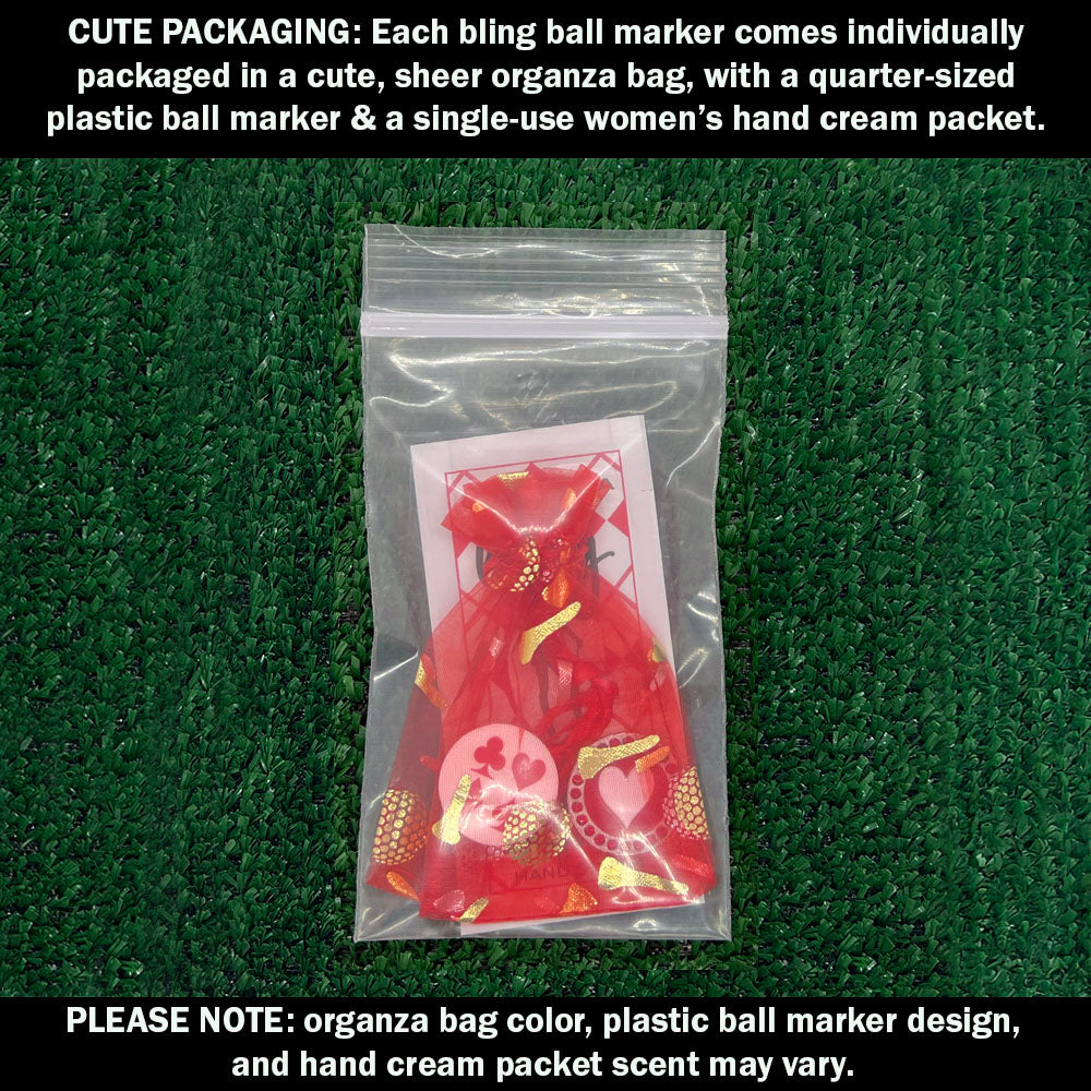 Each marker comes packaged in a golf-themed organza bag, along with a quarter-sized plastic ball marker and a single-use women’s hand cream packet. This accessory is gift-ready for tournaments, luncheons, or as a fun treat for yourself or your foursome. 🎁