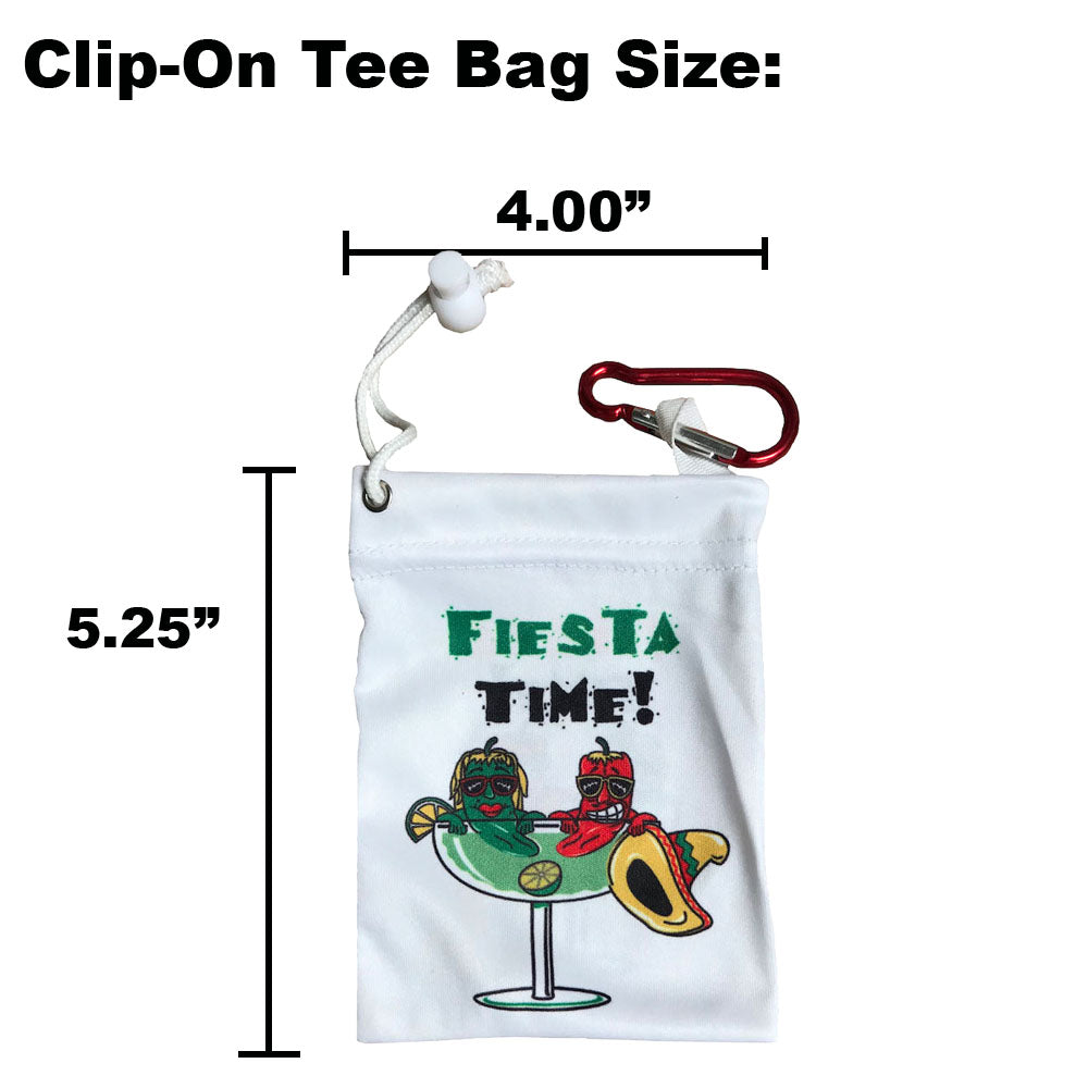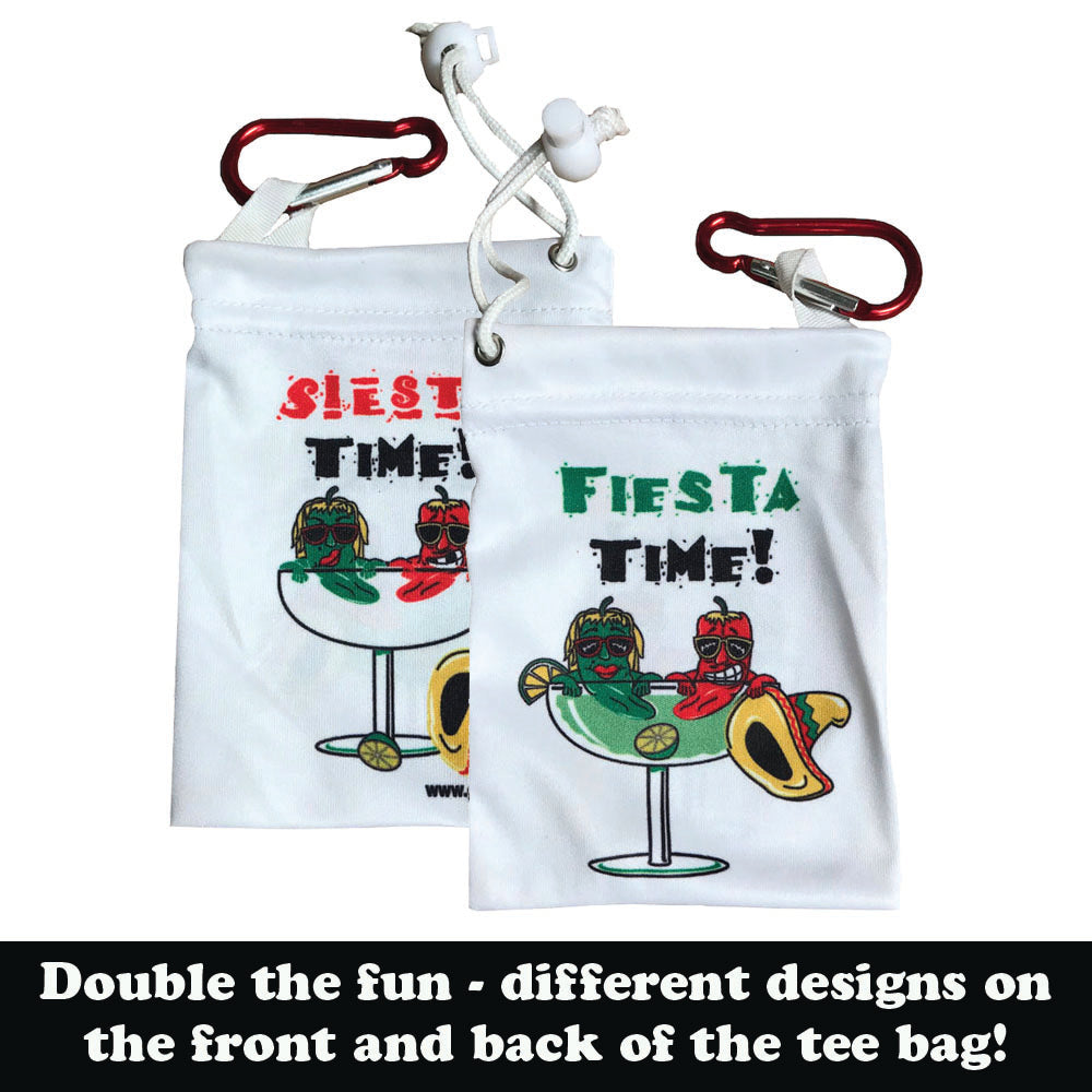 Bring the party to the course with the Fiesta Tee Bag! This white microfiber drawstring bag is bursting with fiesta flair. The front shows a margarita glass with two chili peppers and a sombrero, and the phrase “Fiesta Time!” The backkeeps the laughs going with an empty margarita glass, the sombrero on the ground, and the phrase “Siesta Time!”