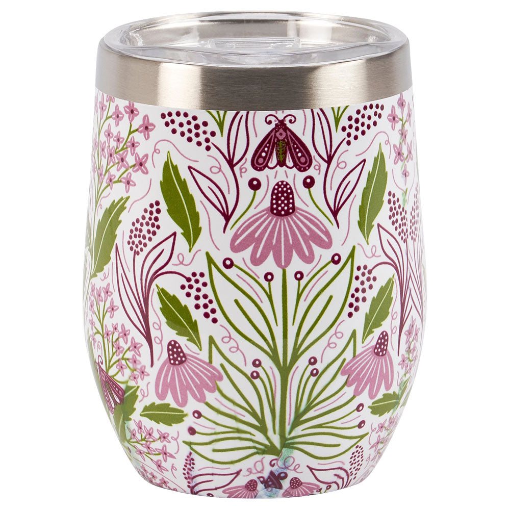 Cheers to this cute tumbler! This stainless steel wine tumbler features purple floral design with green leaves. Holds 12 oz. Includes plastic lid and is insulated to keep beverages cold for 8 hours and hot for 4 hours. Hand-wash recommended. Packaged in a kraft paper box. Size: 4.5" x 3".