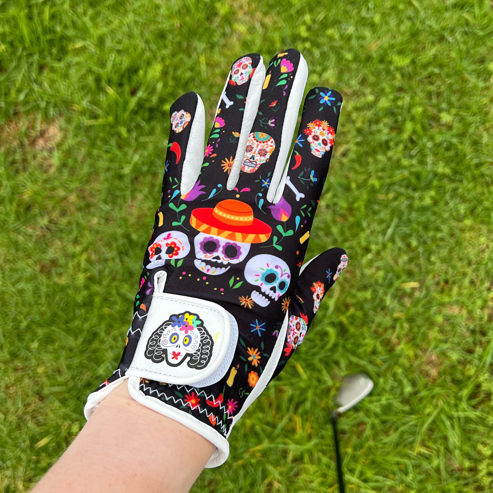 Bring bold style to your game with the Sugar Skulls women’s golf glove. Inspired by Día de los Muertos (Day of the Dead) traditions, this black glove features a vibrant mix of male and female sugar skulls, surrounded by colorful flowers and glowing candles—a tribute to remembrance, joy, and living life to the fullest. 💀🌸🕯️