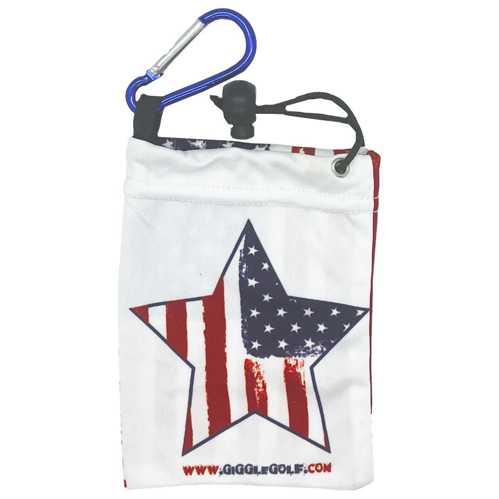 Show your love for golf and country with the USA Flag Tee Bag! This white microfiber drawstring bag features a bold American flag design on the front and a star filled with stars and stripes on the back—perfect for patriotic play all season long.